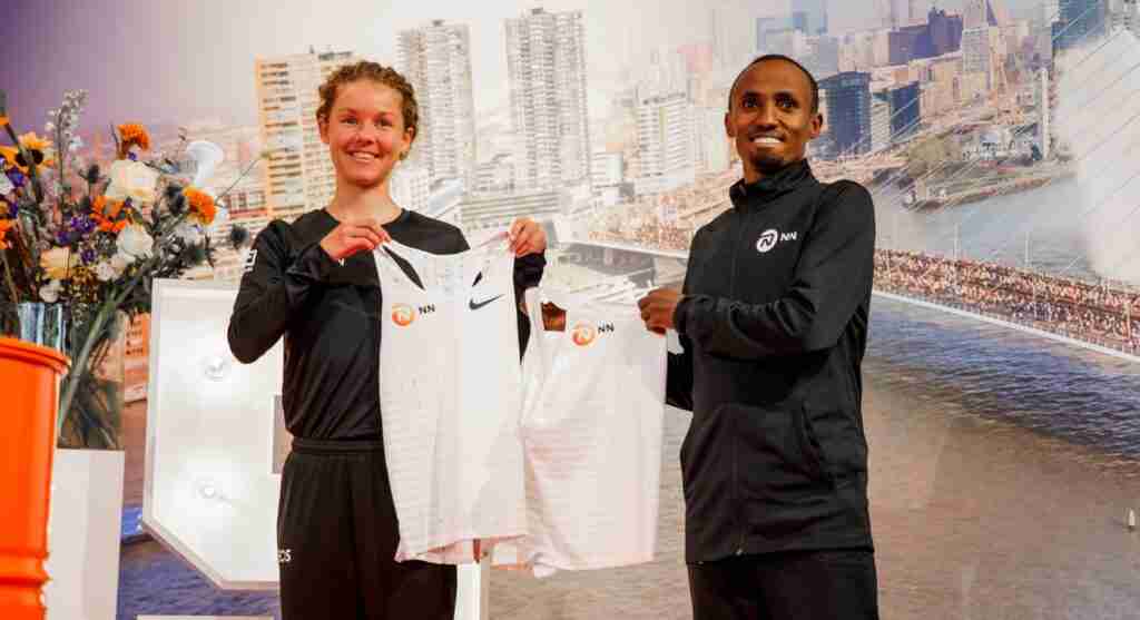 PHOTO: NN Running Team members Nienke Brinkman and Abdi Nageeye of the Netherlands show off their kit at a press conference today in Rotterdam; both athletes will run Sunday's NN Marathon Rotterdam (photo courtesy of NN Running Team)